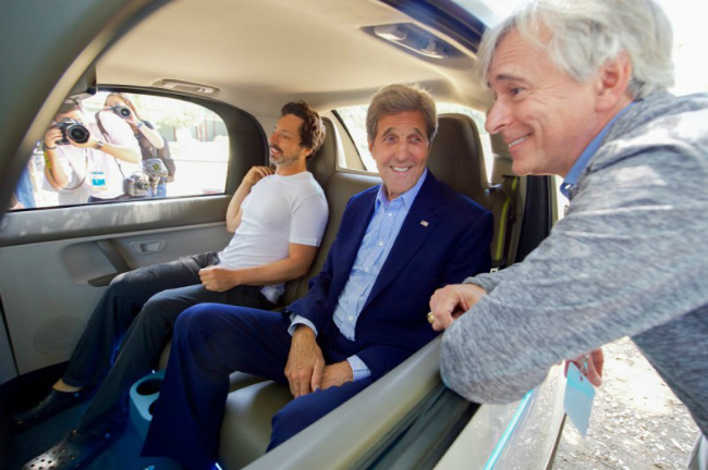 Госсекретарь США Джон Керри в компании Сергея Брина в беспилотном автомобиле Гугл