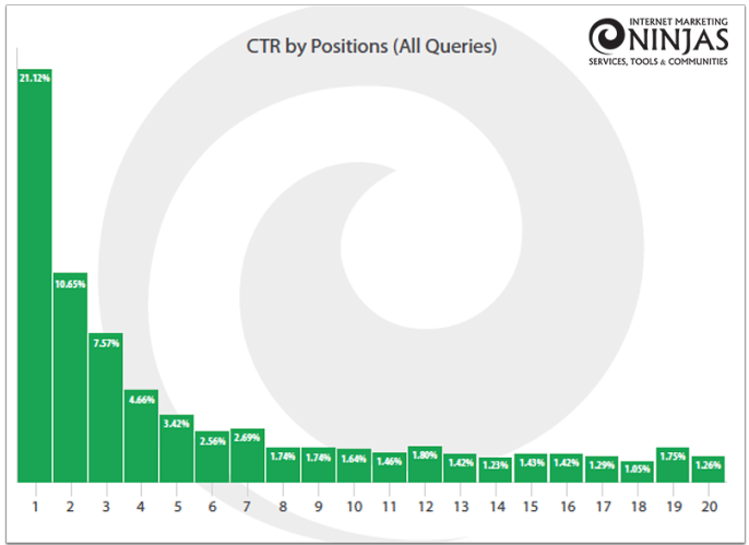 Такие данные приводятся в аналитическом отчете SEO-компании Internet Marketing Ninjas. Согласно исследованию, в процентном соотношении количество кликов (CTR) на первых страницах SERP достигает: