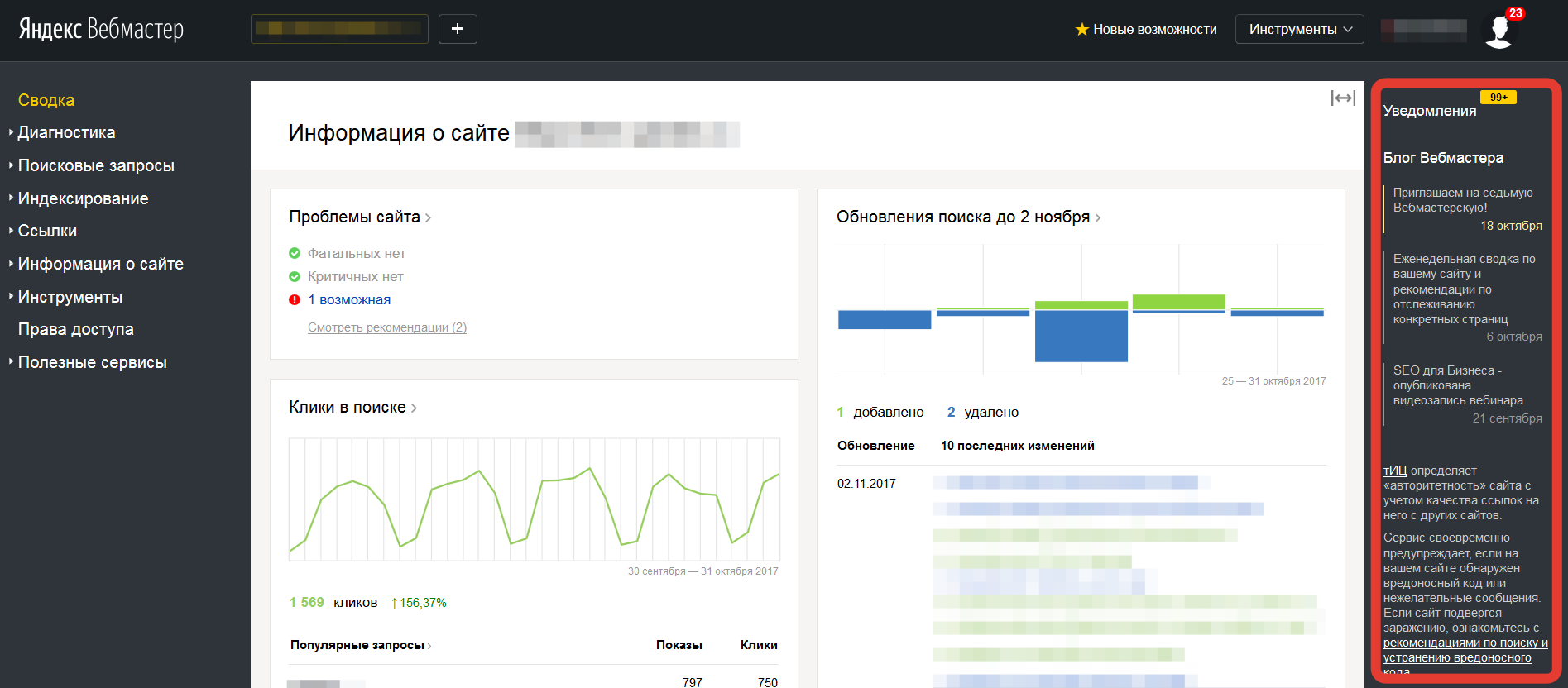 Команда Яндекс.Вебмастера убеждена, что устранение крайней правой колонки позволит увеличить рабочую область, необходимую для построения более наглядных графиков и метрик. Впрочем, что из этого вышло – судить вам.