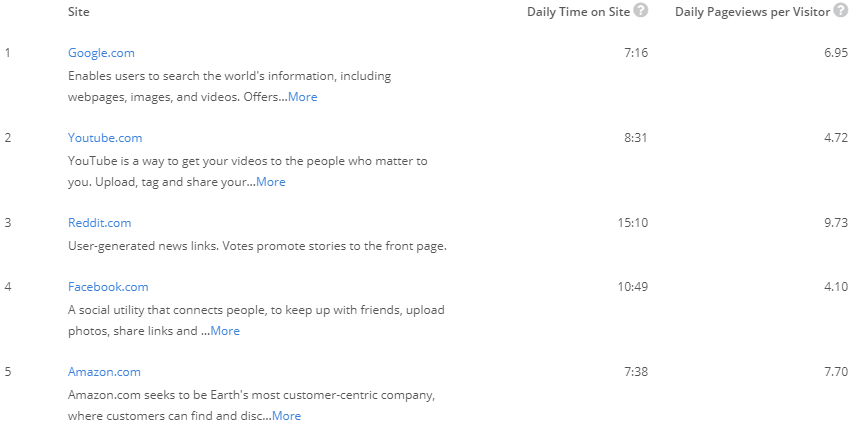 Как свидетельствует скрин, Reddit недаром пробивается на вершину ТОПа. О популярности проекта говорит хотя бы тот факт, что в среднем пользователи проводят на его страницах чуть более 15 мин. Это значительно больше, чем может похвастаться любой другой сайт из приведенного выше рейтинга. Для сравнения: у Google этот показатель в два раза меньше – 7 минут 16 секунд.