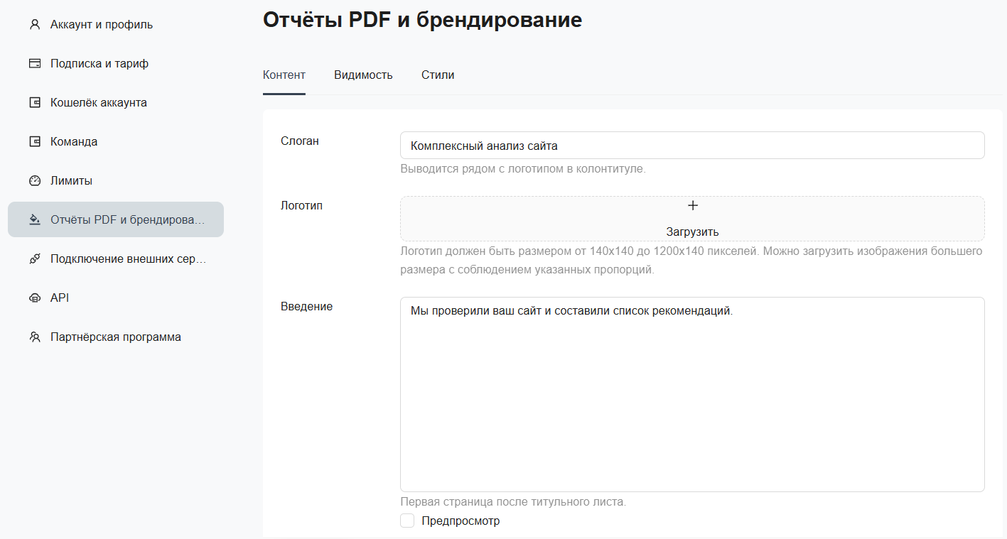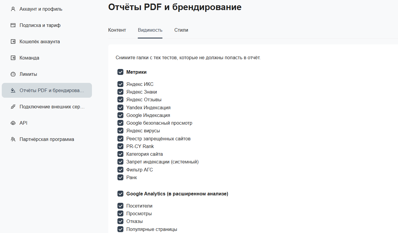 Генерация отчета доступна на тарифах "Начальный", "Профи" и "Агентство", брендирование — на "Профи" и "Агентство".