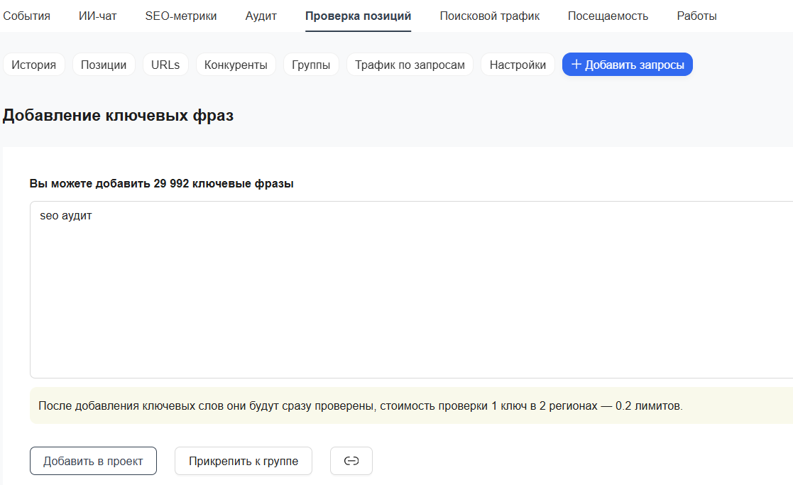 Сервис определяет запросы, по которым индексируется сайт, и показывает их списком. Вы можете выбрать запросы из предложенных или добавить свои.