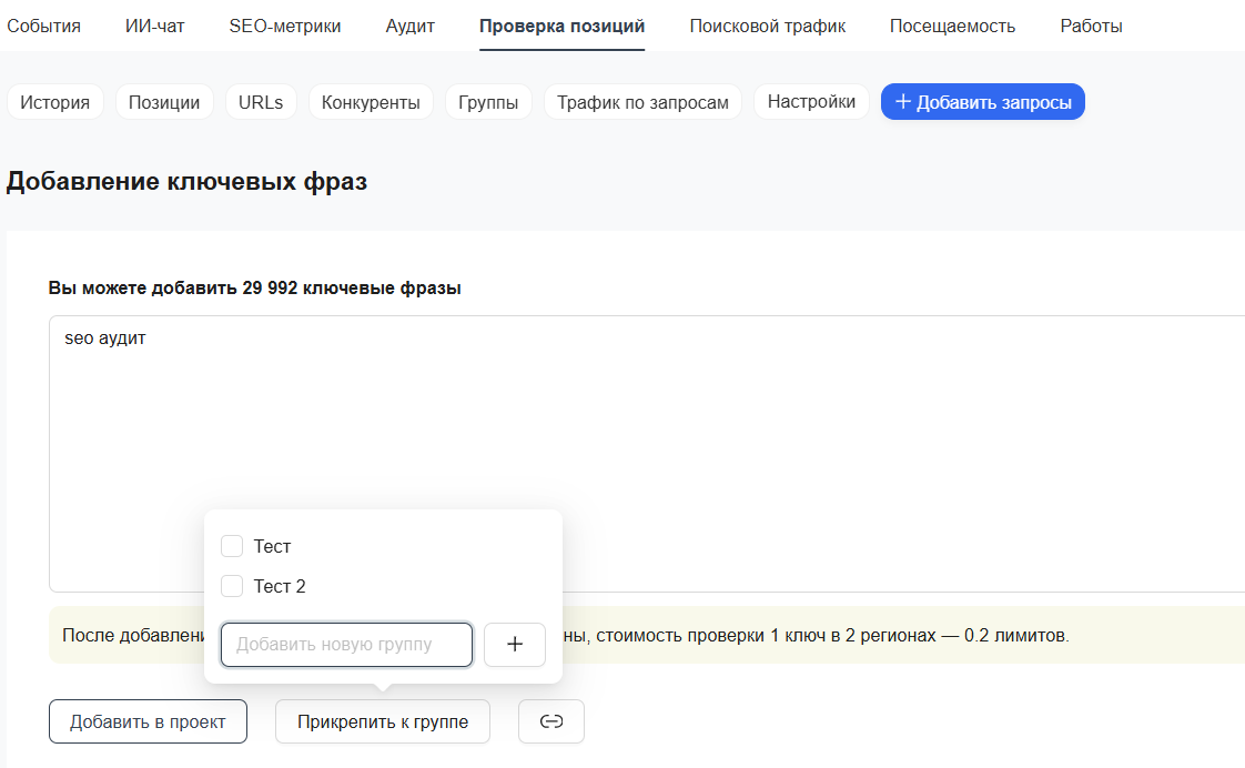 Также можно создать новую группу в разделе «Добавить запросы» при добавлении новых ключевых слов. Перейдите в раздел и впишите в поле запросы. Можно выбрать из предложенных.