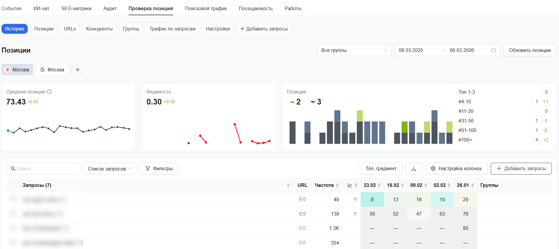 Отчет «История» находится в блоке «Проверка позиций» и по умолчанию показывает среднюю позицию всех слов для каждой из настроенных комбинаций из поисковой системы, региона и устройства. Также вы можете выбрать даты, за которые хотите посмотреть график изменения позиций и любую группу, чтобы увидеть график только для нее.
