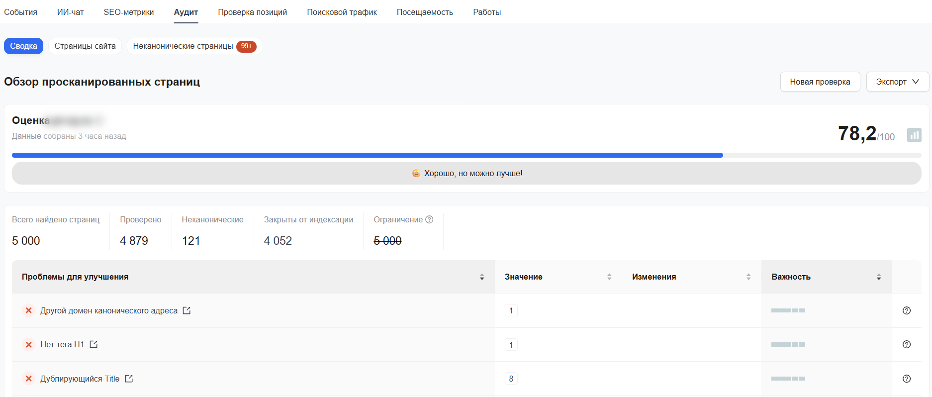 Допустим, просканировано 100 страниц, из которых на 20 найдены ошибки, на 30 — предупреждения. Тогда показатель здровья сайта будет таким: 1 - 20/100 - 0,230/100 = 74%