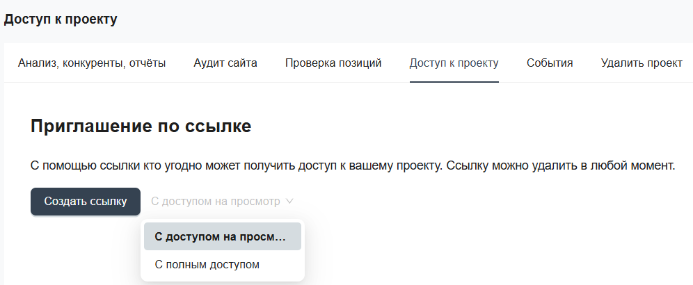 «Анализ сайта» позволяет открыть доступ к проекту с правами на просмотр или редактирование:
