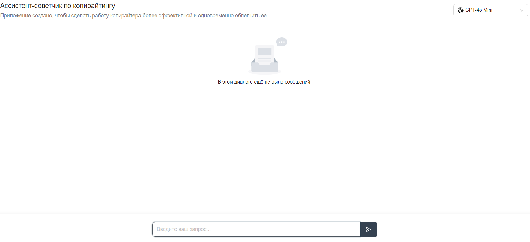 В форме внизу введите свой запрос. Также здесь есть возможность выбрать модель нейросети. Мы создали такой запрос: «Привет, дай топ-10 советов по копирайтингу для новичка».