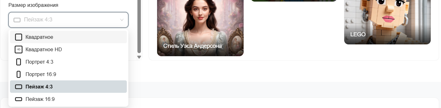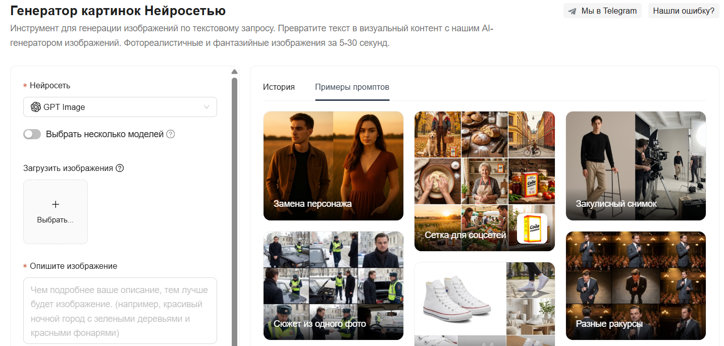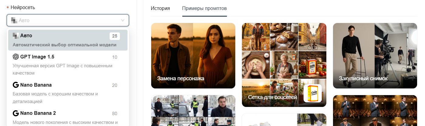 Сначала вам необходимо выбрать нейросеть для генерации изображения. На выбор у вас есть несколько ИИ, от GPT Image до Nano Banana. В основном они различаются качеством генерации, сферой применения и стоимостью в лимитах.