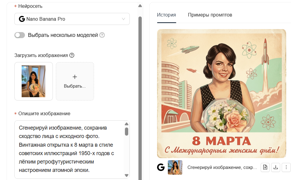 - Nano Banana 2 — модель нового поколения с хорошим качеством и детализацией.