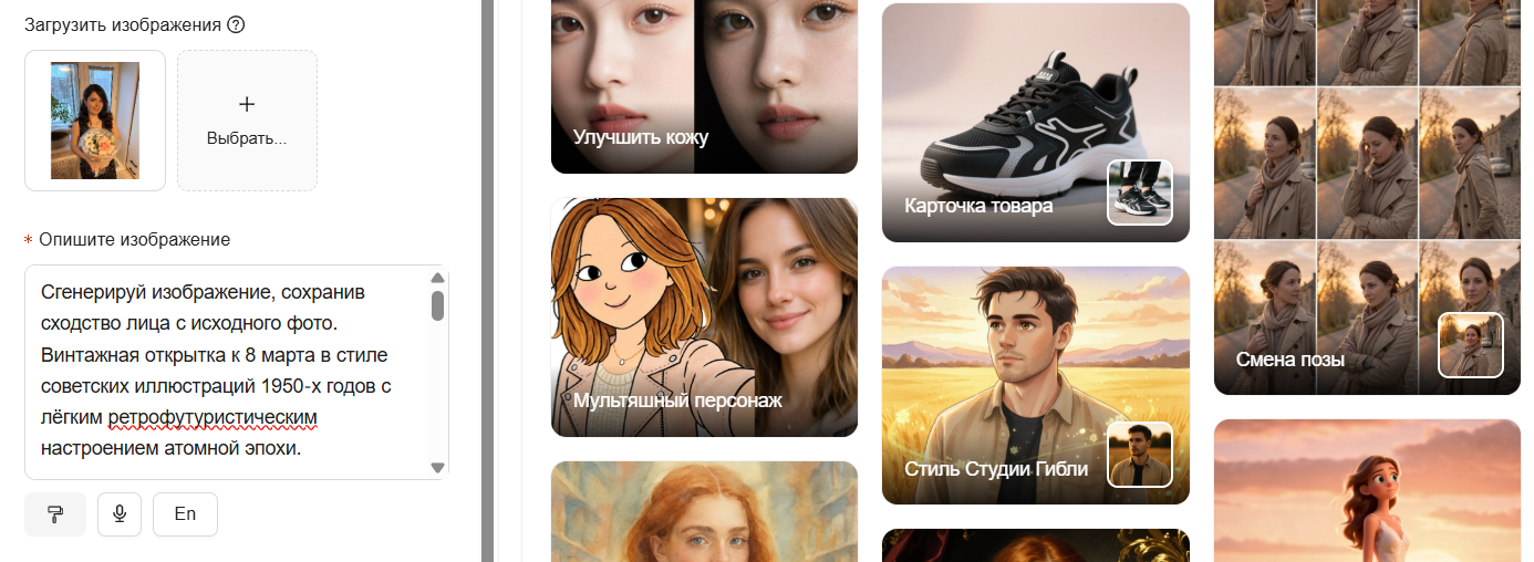 Вы можете загрузить свое изображение (до 4 шт.) через форму загрузки, чтобы ИИ использовал его как пример для генерации. Если вы загружаете свою картинку, не забудьте указать это в запросе.