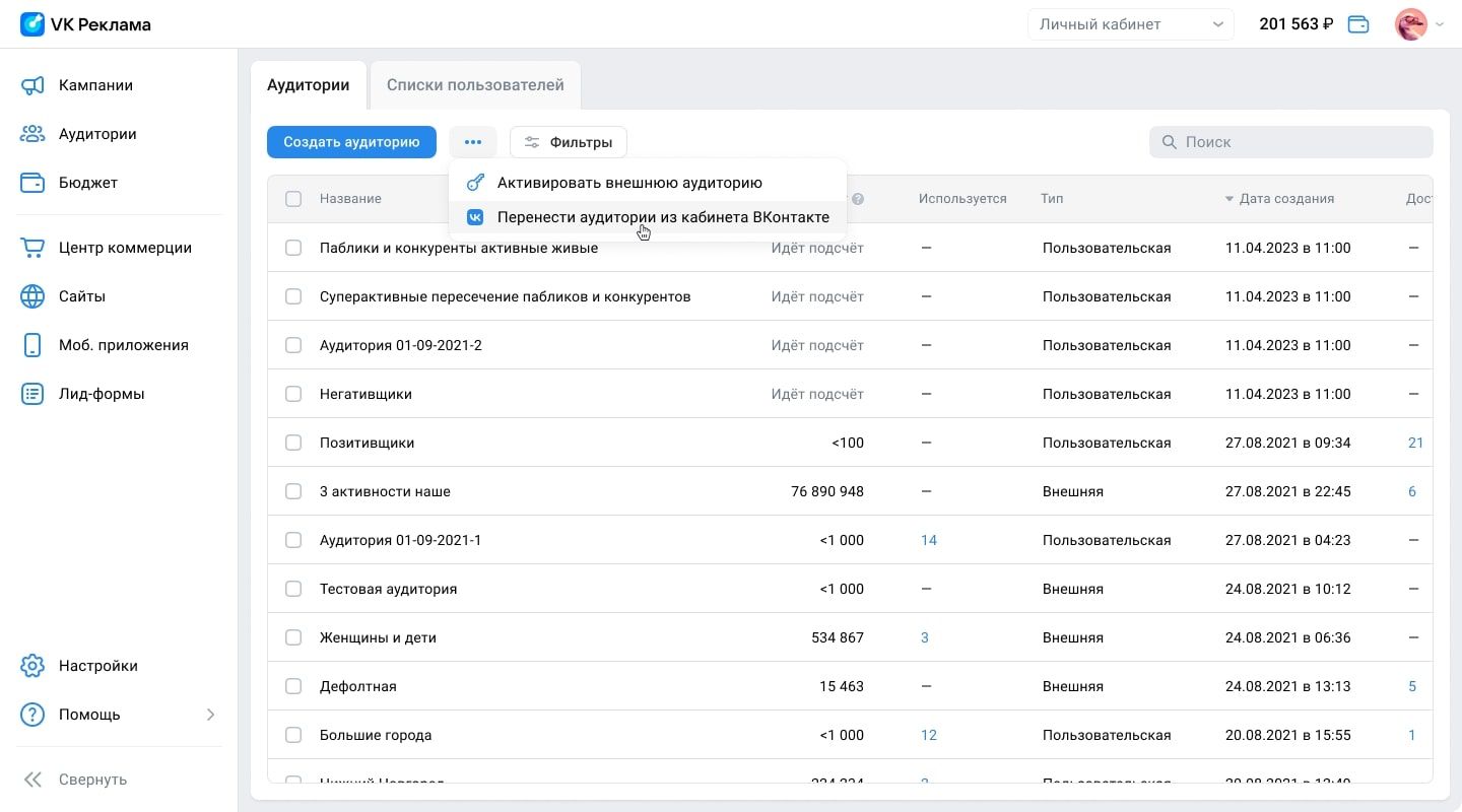 Выбрать вкладку «Аудитории» в кабинете VK Рекламы → Нажать на три точки (слева от кнопки «Создать аудиторию») → В выпадающем списке выбрать пункт «Перенести аудитории из кабинета ВКонтакте».