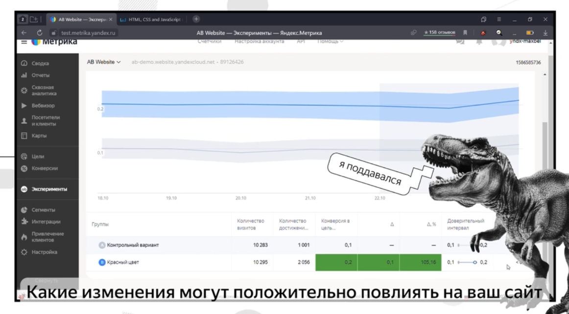 Во время эксперимента каждый посетитель получает идентификатор, и по нему инструмент распознает, какую версию сайта он посетил. Действия фиксируются через счетчик Метрики. По окончанию теста вы увидите результат на инфографике.
