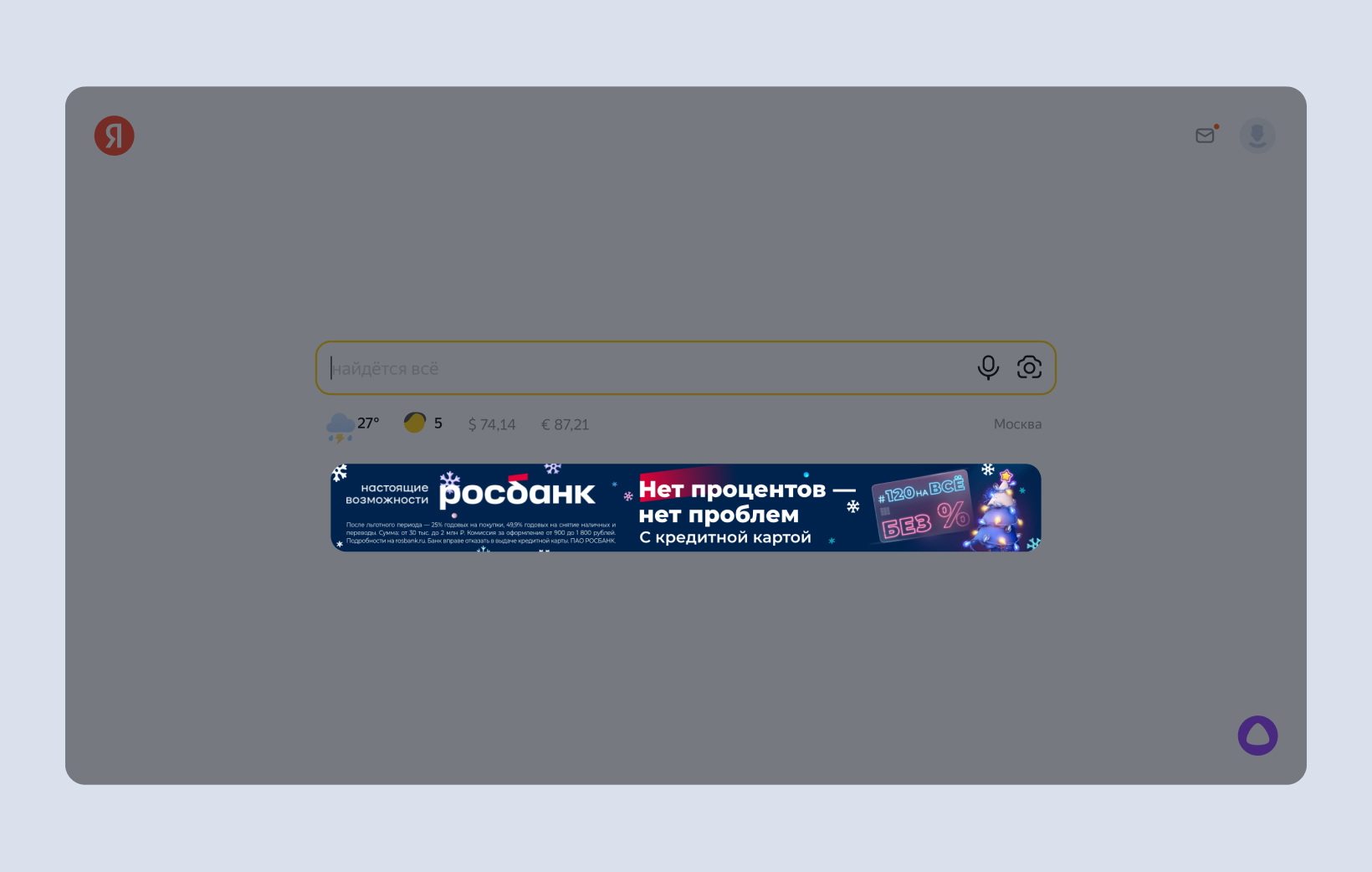 Баннер под поисковой строкой Главной страницы Поиска ya.ru — это самый большой охват во всей Рекламной сети Яндекса. Кроме заглавной страница поисковика баннер располагается на новой вкладке Браузера.