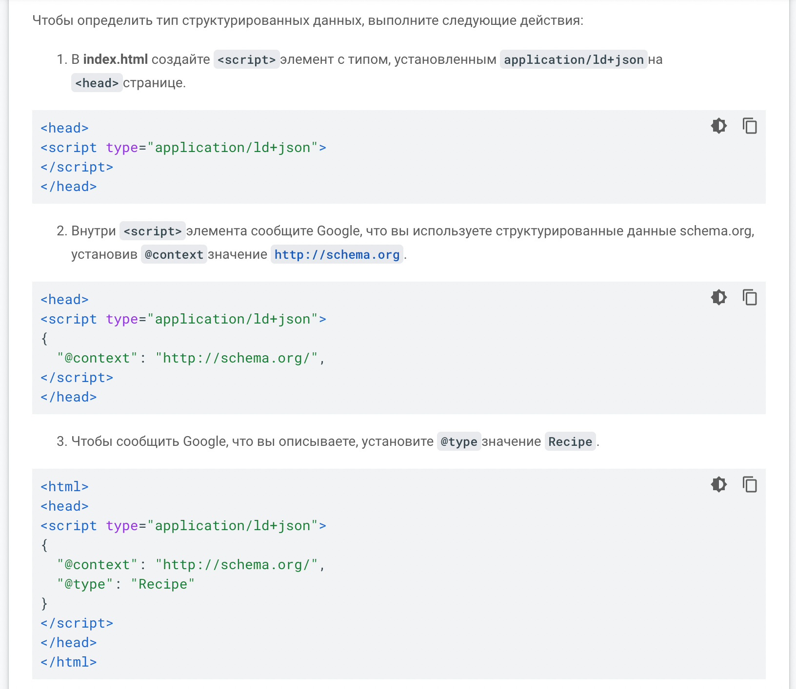 Формат — это тип кода разметки, который передает схему поисковой системе. Есть три основных формата кода разметки: JSON-LD, микроданные и RDFa. Google советует использовать JSON-LD.