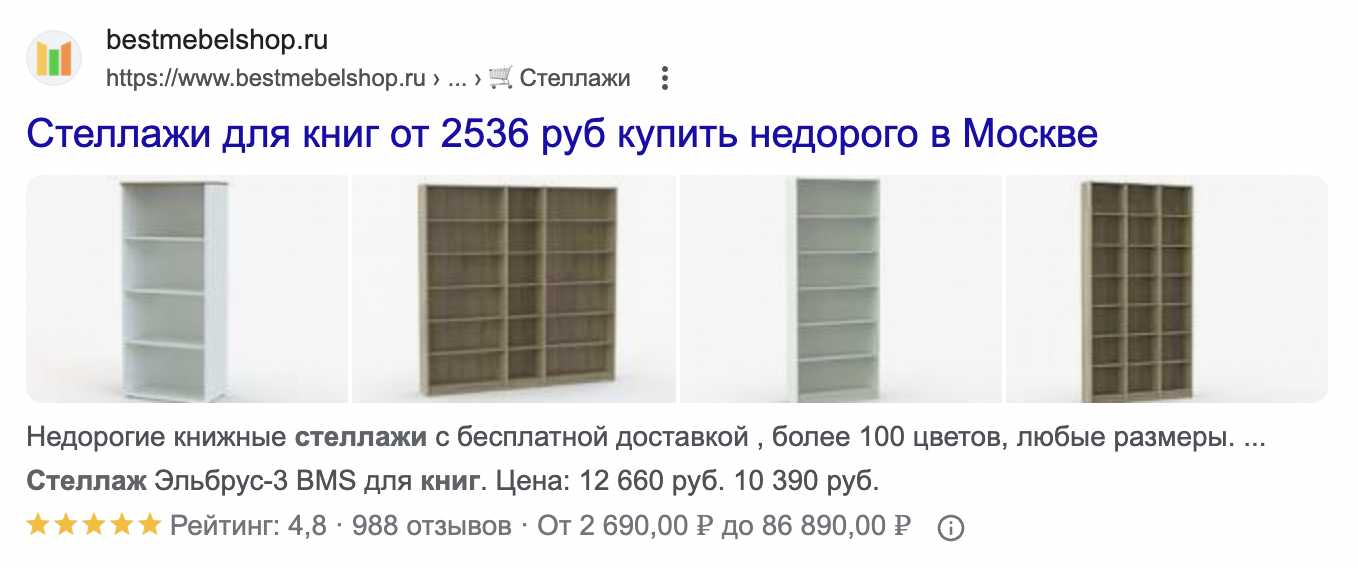Расширенный сниппет или rich snippet — это улучшенный результат поисковой выдачи в Google, который содержит больше информации, чем обычные «синие ссылки», и выглядит более привлекательным для пользователя. В нем показывается дополнительный контент сайта, который поисковый робот берет из структурированных данных страницы.