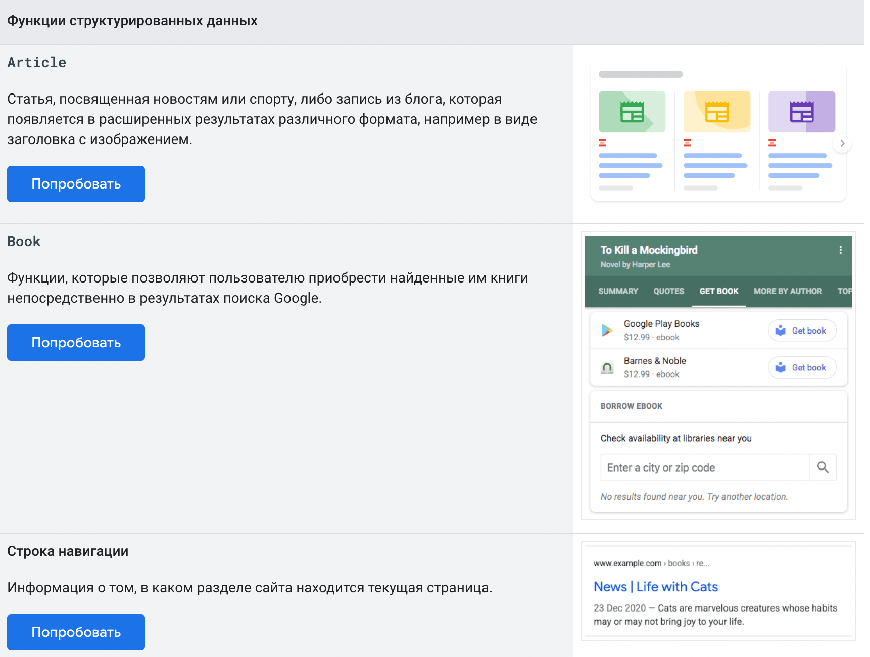 На странице для каждого типа схематично показано, как будет выглядеть сниппет в выдаче.
