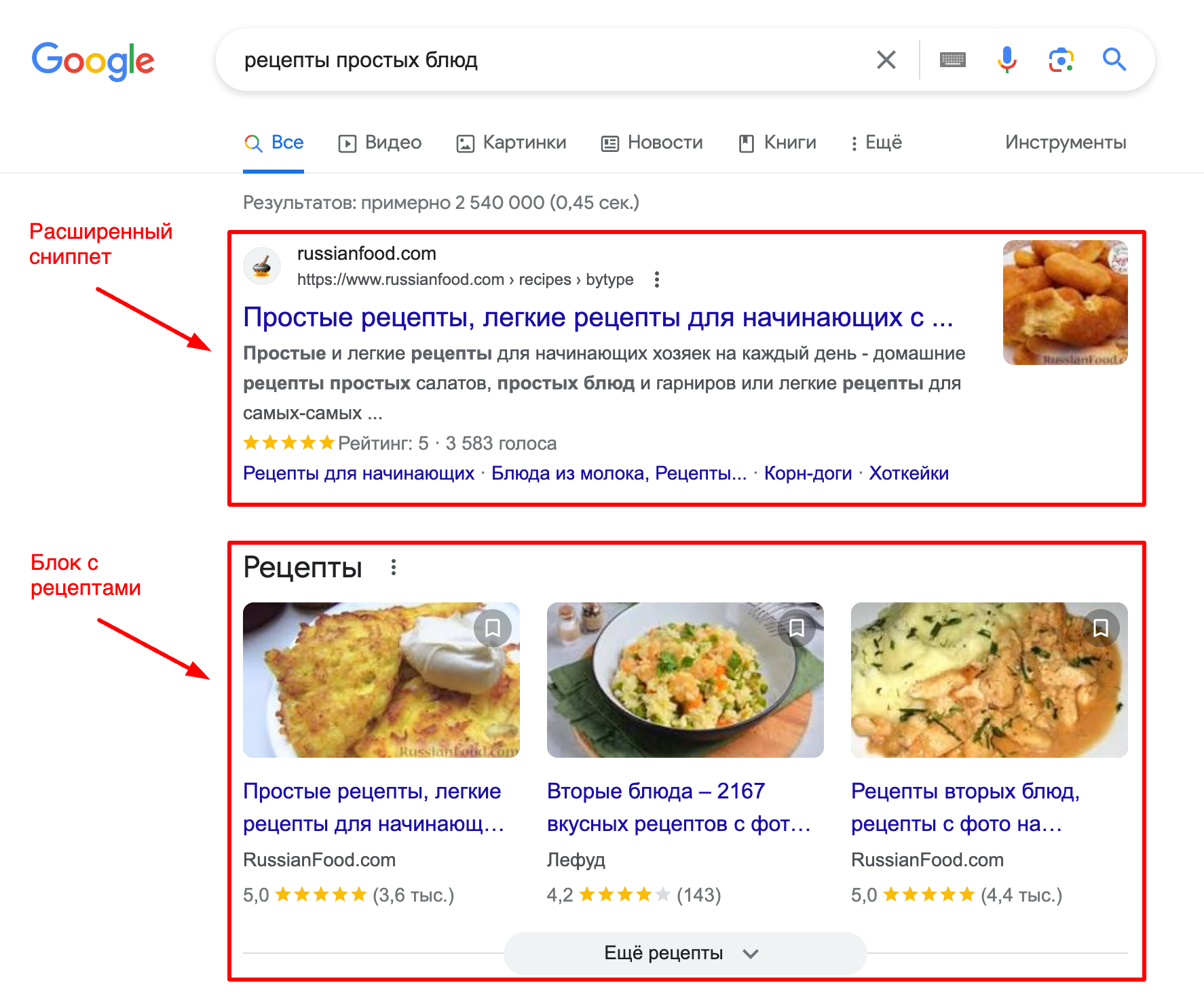 Не путайте расширенные сниппеты с другими блоками Google – книгами, рецептами, авиабилетами и прочими, где поиск собирает информацию с разных сайтов.