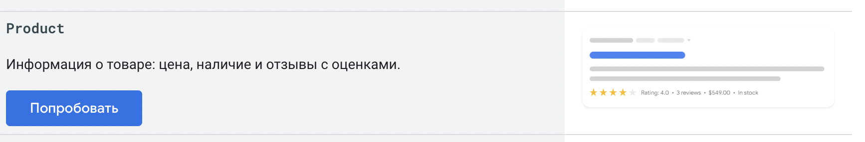 Их существует более тридцати типов, в том числе и то, что по-русски называется расширенным сниппетом. В официальной документации это ближе всего к Product, где отображается цена, отзывы и другая полезная информация со страницы. По-английски такие сниппеты называют rich snippets.