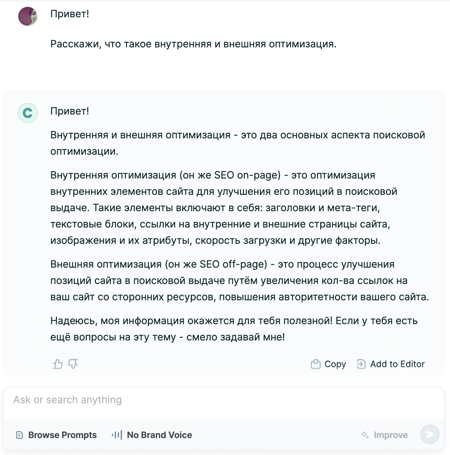 Сервис на базе OpenAI. Он умеет писать статьи, описания товаров, письма, тексты для рассылок, описания для видео, комментарии и отзывы. Все функции сервиса — это шаблоны запросов к чат-боту, но можно обратиться к нему напрямую и сформулировать задачу.