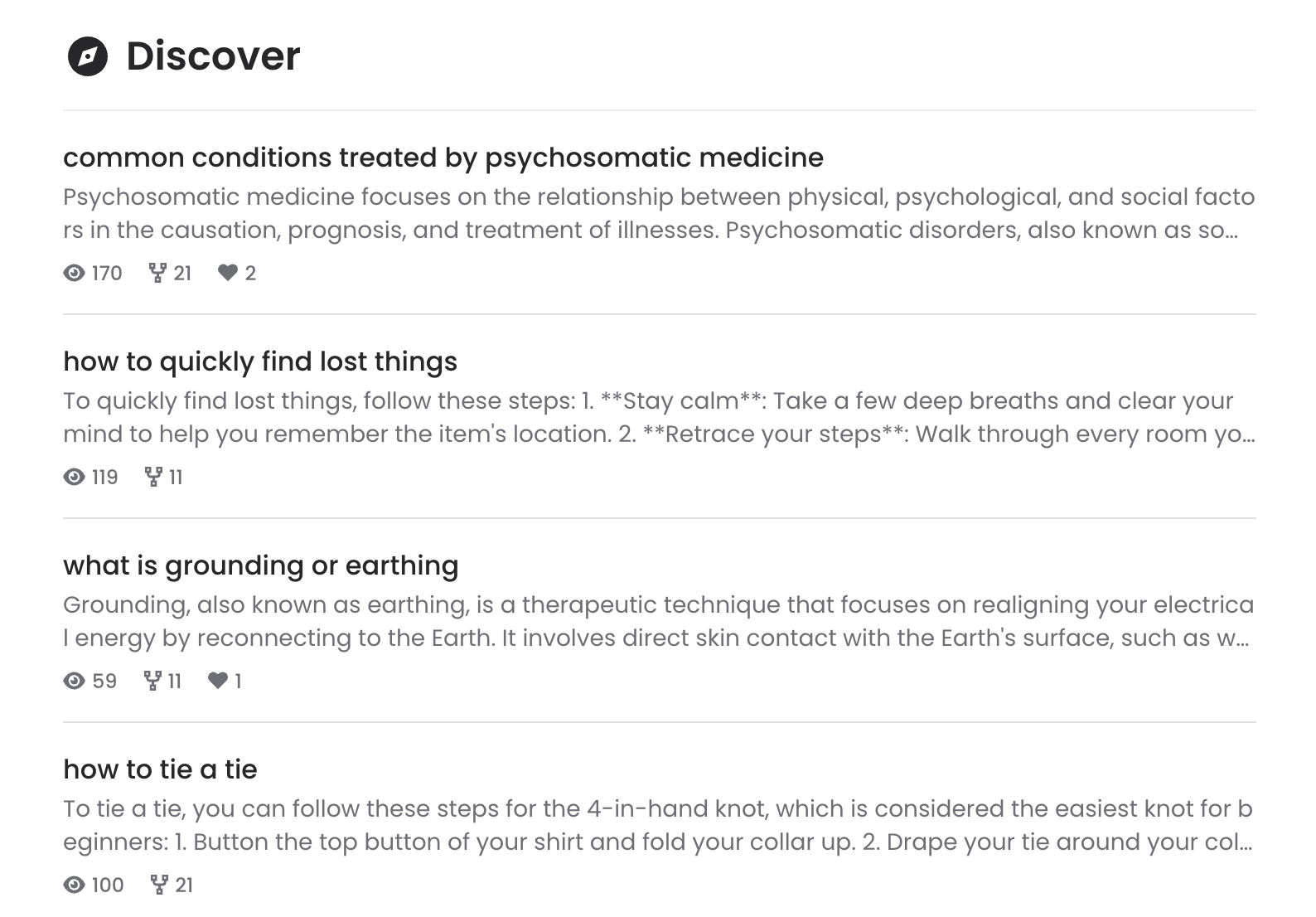 В разделе Discover можно найти список чужих вопросов, но не очень понятно, зачем они нужны — для изучения запросов пользователей есть более эффективные методы, а никакой новой уникальной информации чат-бот не даст.