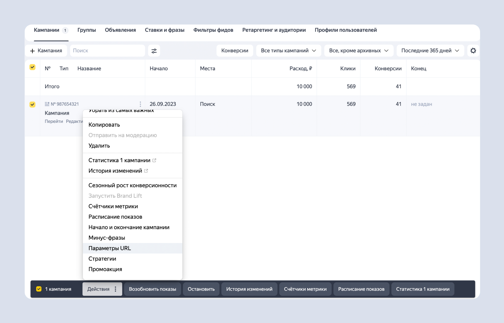 Массово добавить метки можно через меню «Действия»→«Параметры URL» на страницах Кампаний, Групп или Объявлений.