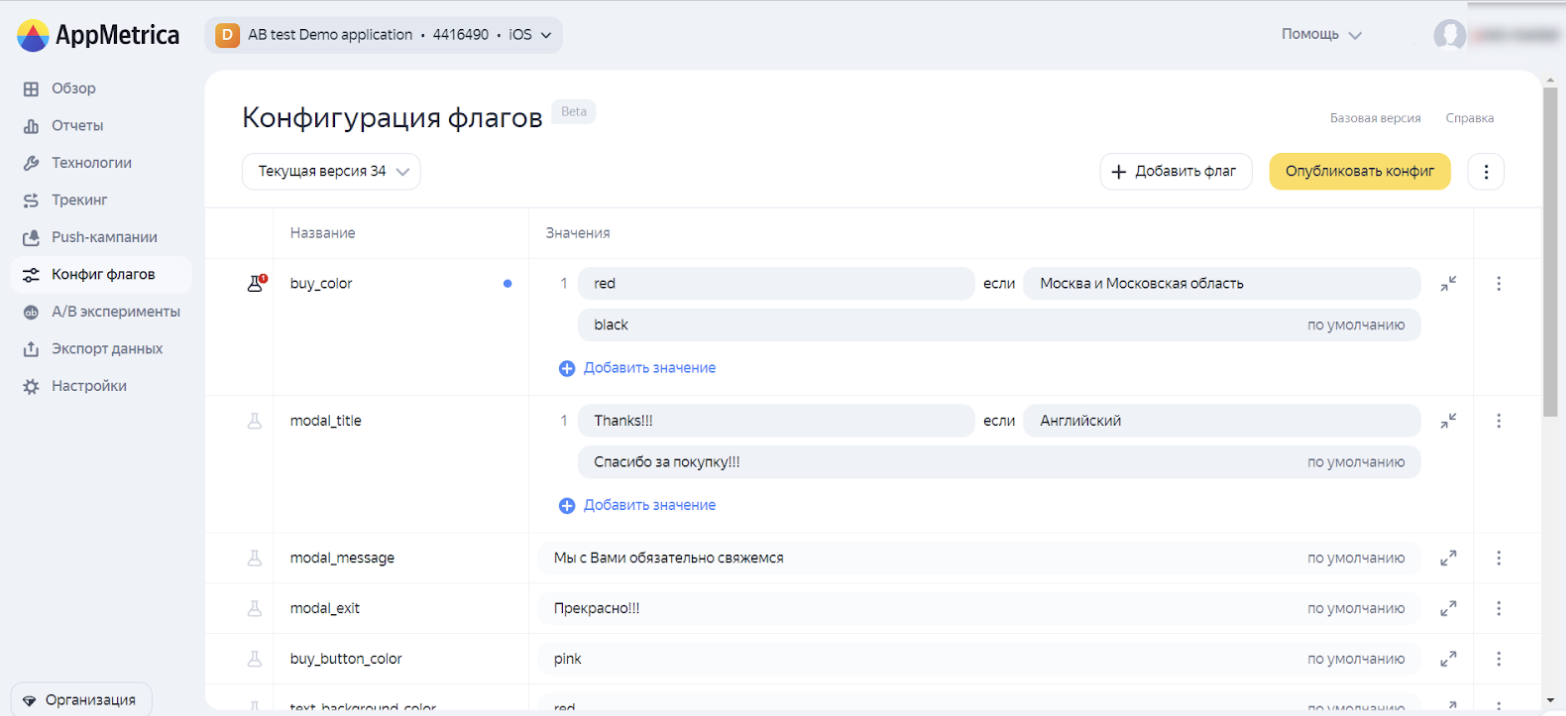 С помощью «Конфигурации флагов», которая лежит в основе A/B-тестов, можно задавать конкретные параметры проверки – поставить флаг для нового рекламного баннера, раздела в интерфейсе и другое. Флаги могут быть поставлены как для всех пользователей приложения, так и для выборочных сегментов.