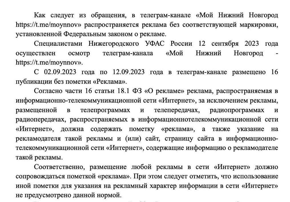 Федеральная антимонопольная служба (ФАС) завела первое дело по обновленному закону «О рекламе» на Telegram-канал «Мой Нижний Новгород». Согласно материалам дела в канале опубликовали 16 рекламных постов без надлежащей маркировки: