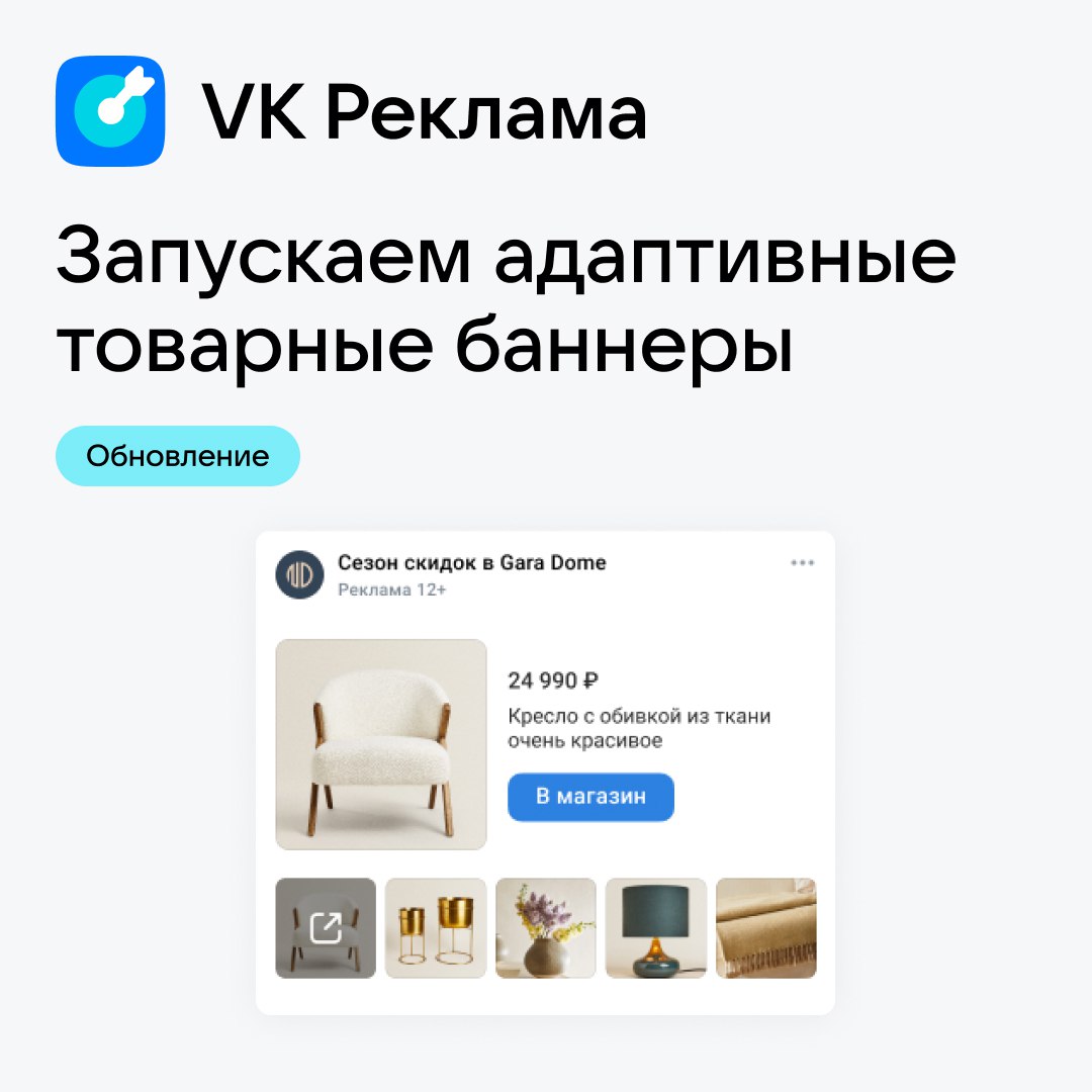Новый формат «Адаптивные товарные баннеры» предназначен для продвижения товарных каталогов. Их основное отличие — они автоматически настраиваются под все рекламные площадки, входящие в экосистему VK.