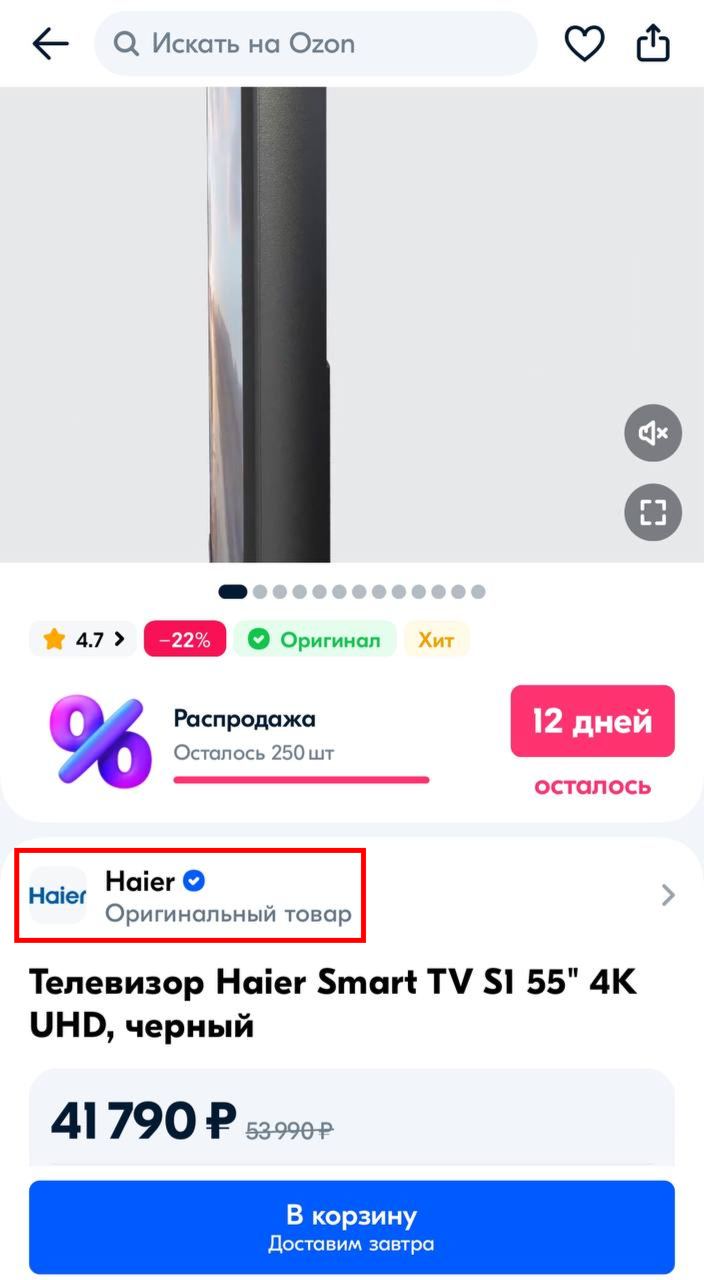 Логотип с указанием бренда и галочкой отображается в верхней части карточки. Такие товары будут продвигаться отдельно на деньги из заложенной суммы. Они попадают в топ выдачи товаров в списке брендов в фильтрах и подсвечиваются при вводе названия бренда в поисковую строку. Через карточку по кнопке логотипа можно на страницу со всеми предложениями бренда.