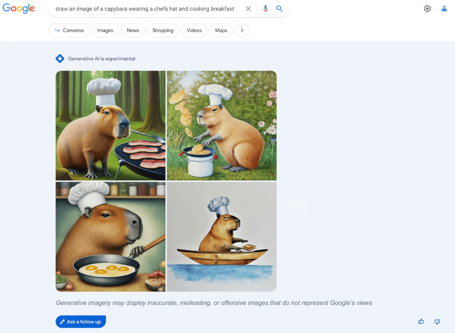 Каждое изображение ИИ дополняет деталями. Например, при запросе «нарисовать капибару в поварском колпаке, готовящей завтрак» SGE предложит сделать изображение фотореалистичным, добавить светло-голубые облака на фон или переместить действие в лес. У каждой версии картинки можно просмотреть промт и при желании отредактировать его.