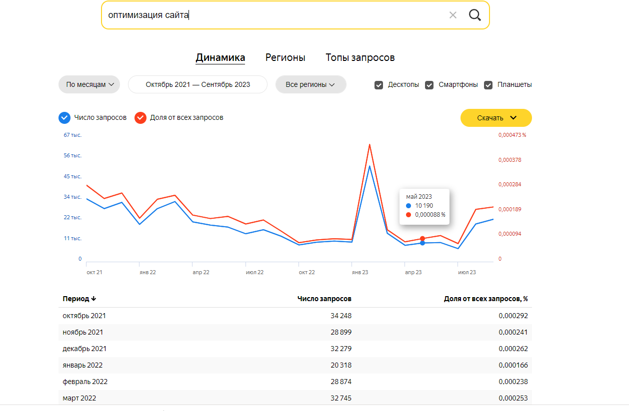 Топы запросов — самые популярные формулировки по теме за конкретный период;.