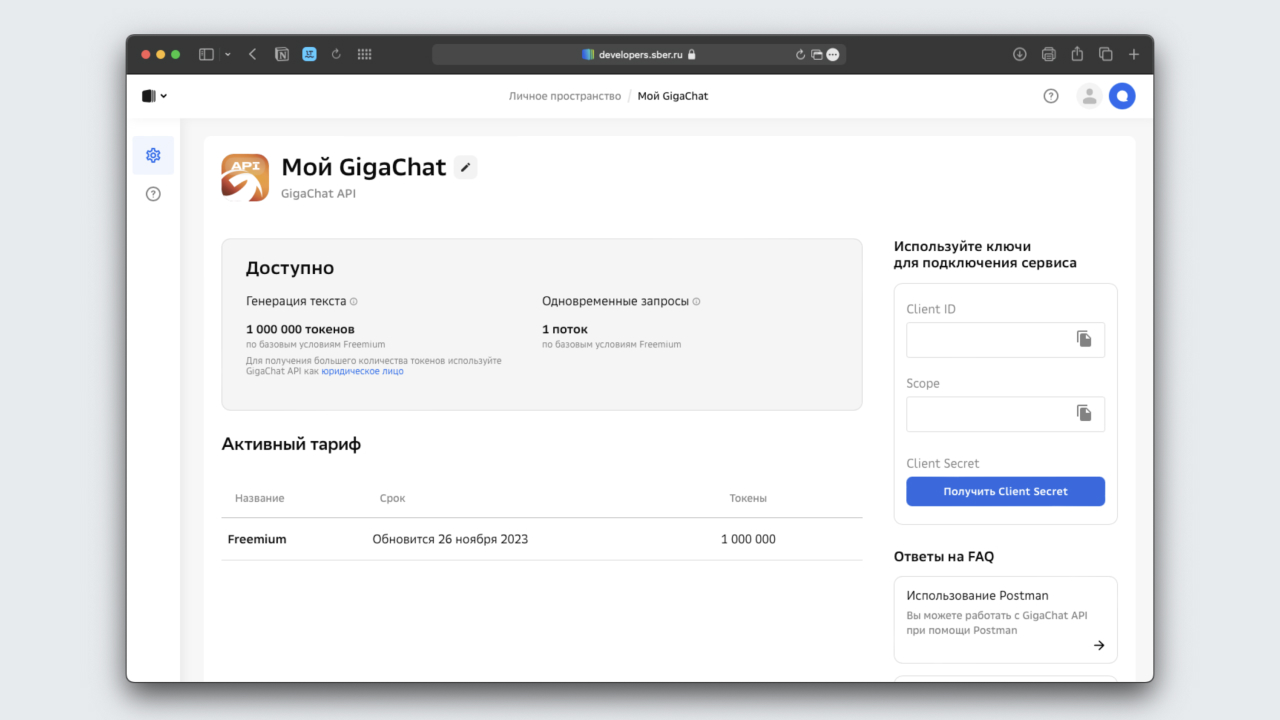 Чтобы получить доступ к API, авторизуйтесь на сайте разработчиков через Сбер ID. Бесплатные токены для генерации текста начисляются ежемесячно. Токены запросов и ответов суммируются. То есть при запросе в 50 токенов и ответе на 150 вы потратите 200 токенов.