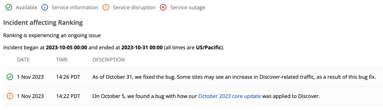 Команда Google сообщила, что во время ночного апдейта случилась ошибка, направленная на рекомендательную ленту Discover. Некоторые сайты могли видеть неестественный прирост трафика в этом сегменте.