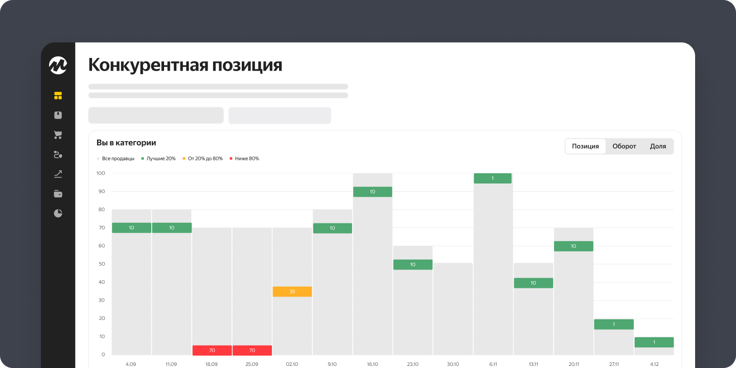 «Конкурентная позиция» показывает ваше место среди продавцов на маркетплейсе в виде графика. Инструмент позволяет настроить период и категорию товаров, и он отображает: