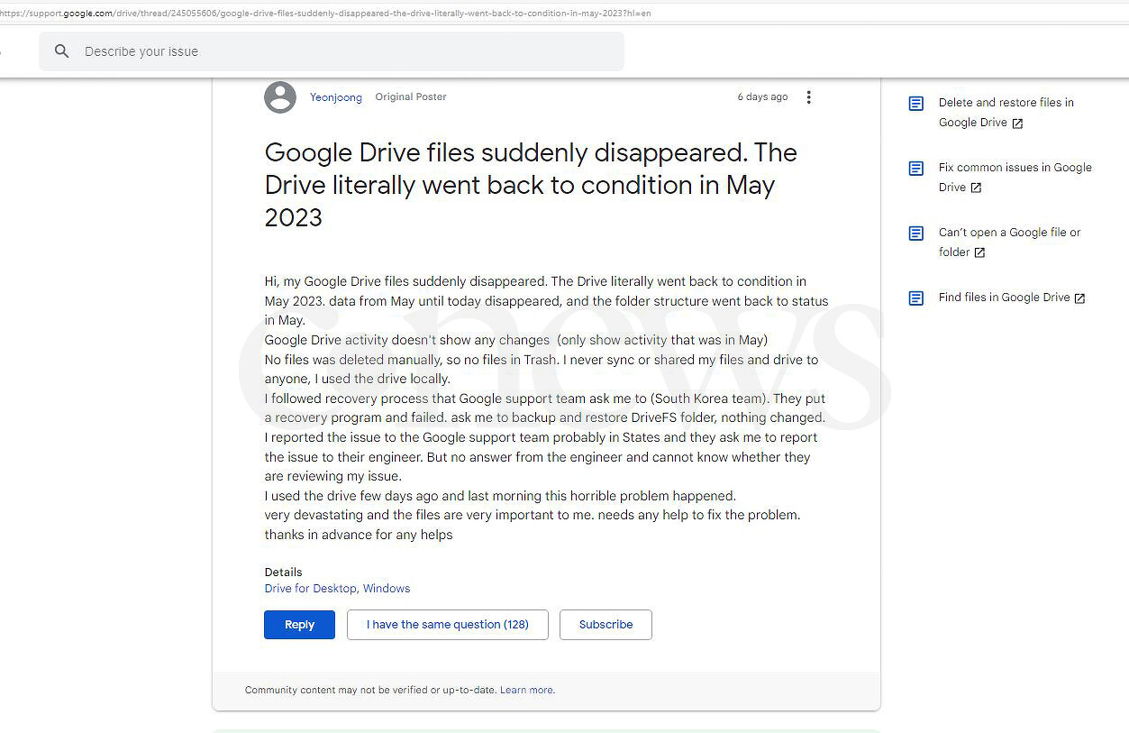 Пользователи облачного хранилища данных от Google по всему миру теряют доступ к архивам своих данных. Они не могут взаимодействовать с загруженными файлами, поскольку они не отображаются вовсе. Первые подобные случаи возникли еще несколько дней назад, но Google по-прежнему не дал официального комментария или какого-либо внятного решения проблемы. Одну из ведущих веток на форуме Google ведет южнокорейский пользователь под ником Yeonjoong. Вот, что стало известно из его комментариев: