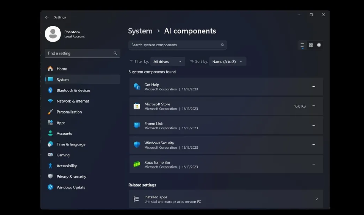 Пользователи обнаружили новый раздел «компоненты искусственного интеллекта» в приложении «Настройки» в предварительной сборке Windows 11. В нем можно мониторить и удалять компоненты на основе ИИ из ОС. Сейчас функциональность раскрыта не полностью, например, из системы по-прежнему нельзя удалить Copilot. В категории раздела находятся Microsoft Store, Помощь, Телефонная ссылка, Безопасность и игровая панель Xbox.