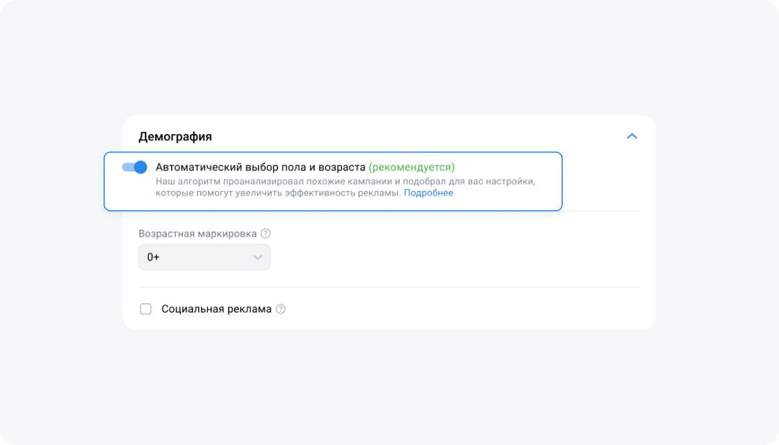 Настройка появляется во время создания кампании на этапе создания группы объявлений в блоках «Демография» и «Интересы и поведение». Пол, возраст и интересы формируются автоматически при включенной настройке, а остальные параметры устанавливаются вручную.