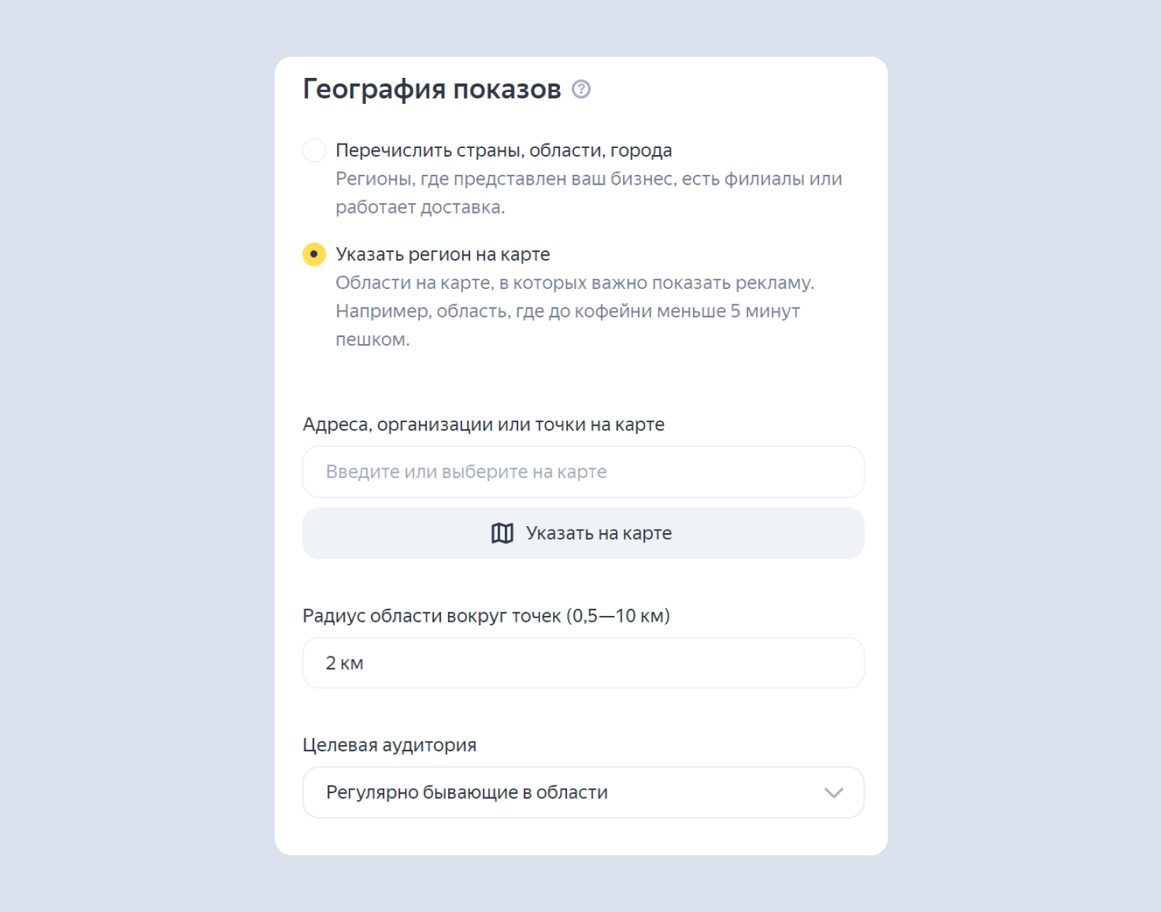 Настроить таргетинг по местоположению можно в блоке «География показов». В нем следует указать адреса или точки на карте, выбрать радиус области и выбрать тип целевой аудитории: