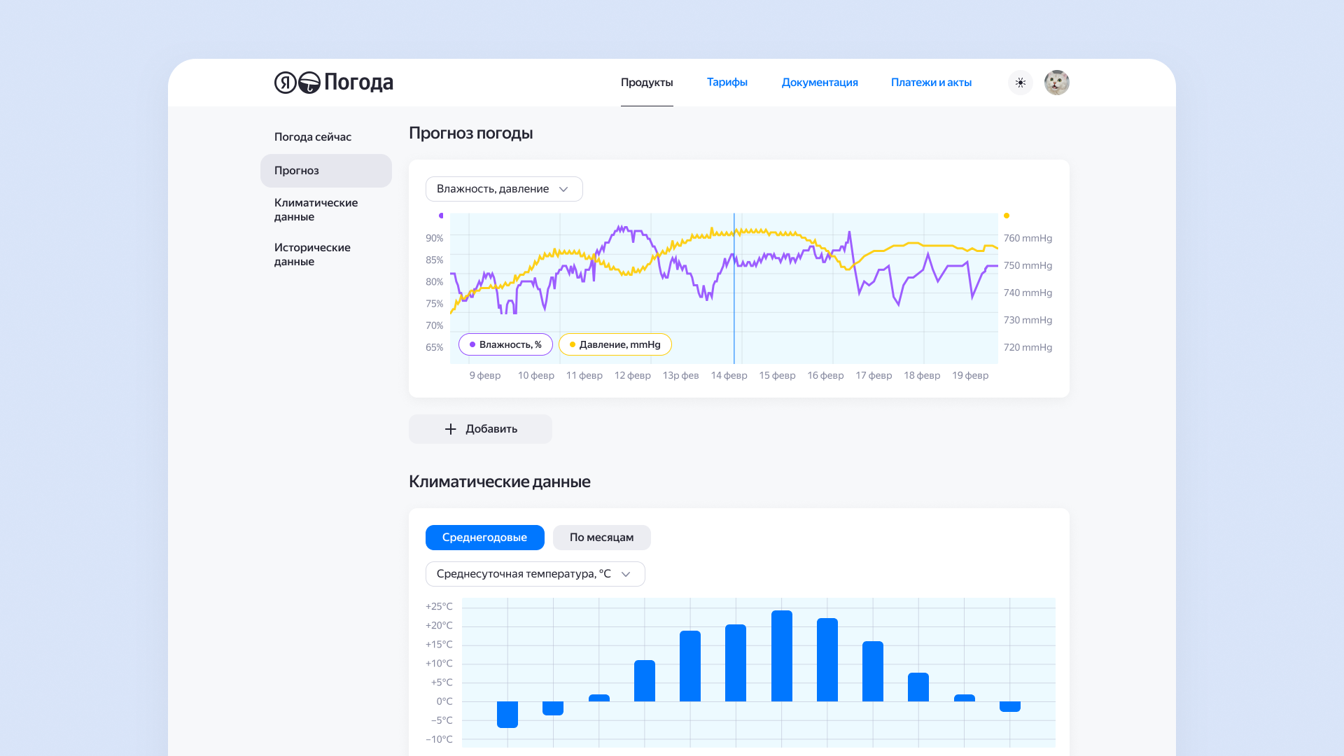 Новые инструменты Погоды можно интегрировать в свою аналитическую систему или CRM. Прогноз для организации доступен на полгода, на месяц или можно заказать ежечасные исторические сводки о погоде на конкретной территории страны, начиная с 1950 года. Сервис также предложит индивидуальное предложение от аналитиков и метеорологов.
