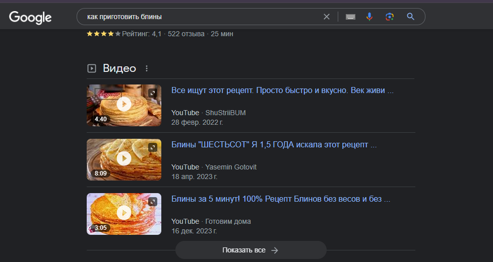 Еще один плюс загрузки видео на YouTube для попадания в выдачу Google — видео в сниппетах в обычной выдаче отображаются только если они залиты на видеоплатформу. Для остальных видео есть возможность попасть во вкладку «Видео» или в расширенные результаты.