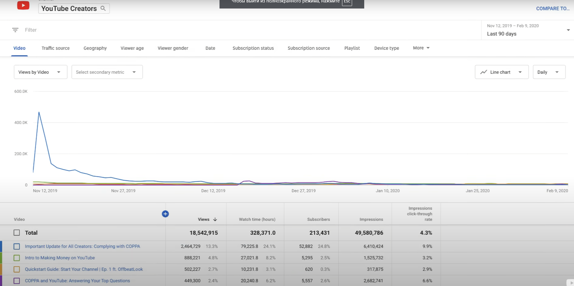 Время просмотра каждого видео отдельно и на канале в целом;