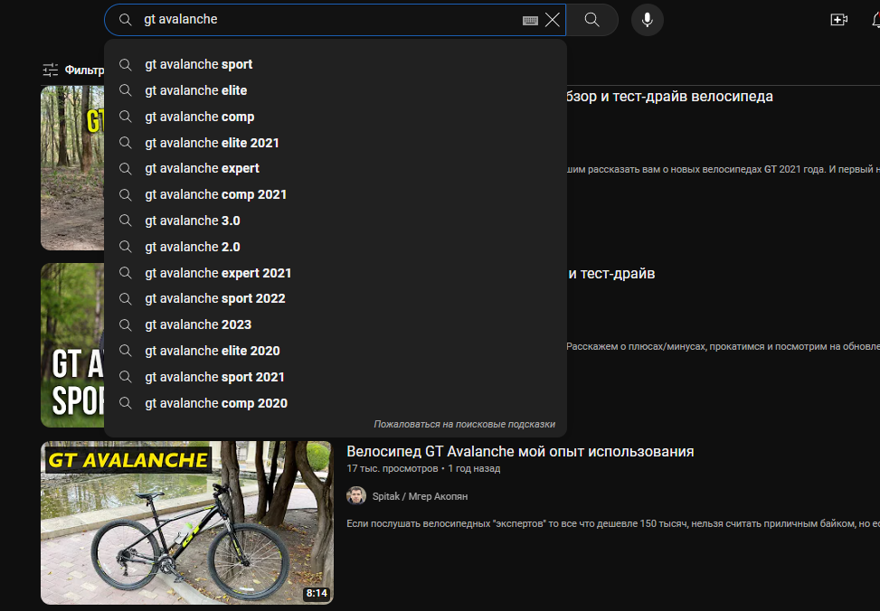 Расширить семантическое ядро вам помогут подсказки в поисковой строке YouTube. Например, если вы торгуете запчастями для велосипедов определенных марок, то есть смысл пробовать различные ключи с популярными видео по смежным темам.
