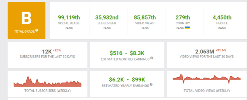 Для более детальной бизнес-аналитики есть сторонние сервисы, например, SocialBlade. Он помогает прогнозировать доход, показывает рейтинг канала в своей стране и своей ниши, показывает подробную детализацию за последние 30 дней, а также строит прогноз роста канала.