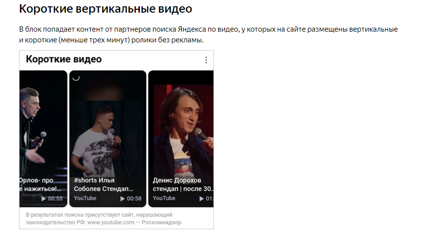 В этот раздел Яндекса попадают только видео из короткой ленты Shorts на YouTube.