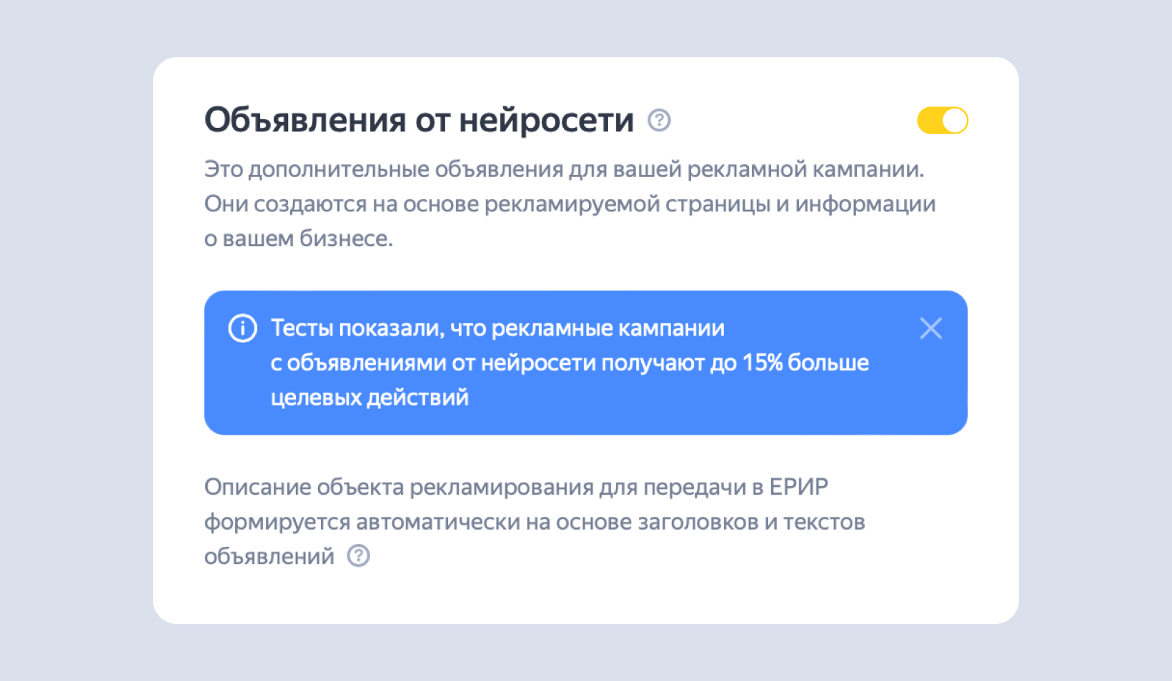 В Мастере кампаний появился новый блок «Объявления от нейросети». При его подключении Яндекс создаст и добавит в рекламу дополнительные объявления. Ее можно включить как для действующих кампаний, так и при создании новых.