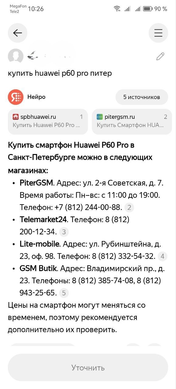 Результаты выдачи у Нейро и поисковика отличаются. Нейросеть выдает несетевые магазины и их адреса.