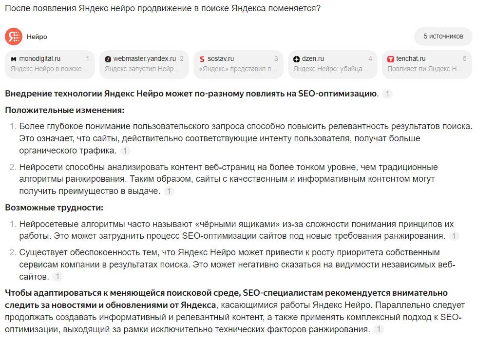 Преимущество для SEO-специалистов в том, что нейросеть способна анализировать метрику и контент страниц на более тонком уровне. Это означает, что сайты с качественным и информативным контентом получат преимущество в поисковой выдаче нейросети.
