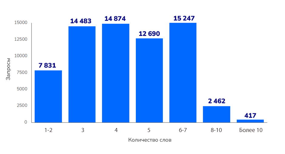 Согласно результатам исследования, сейчас основная масса запросов у финансовых сайтов из топа выдачи состоит из 3-7 слов, однако больше всего трафика приносят запросы из 2-3 слов.