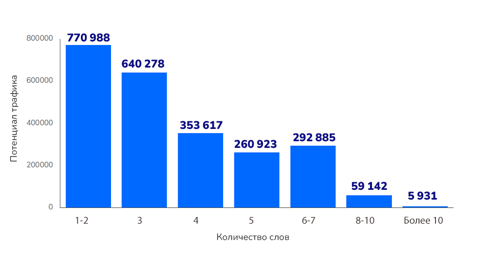 Так, согласно исследованию, выглядит потенциал трафика у запросов с количеством слов от 1-2 до 10+: