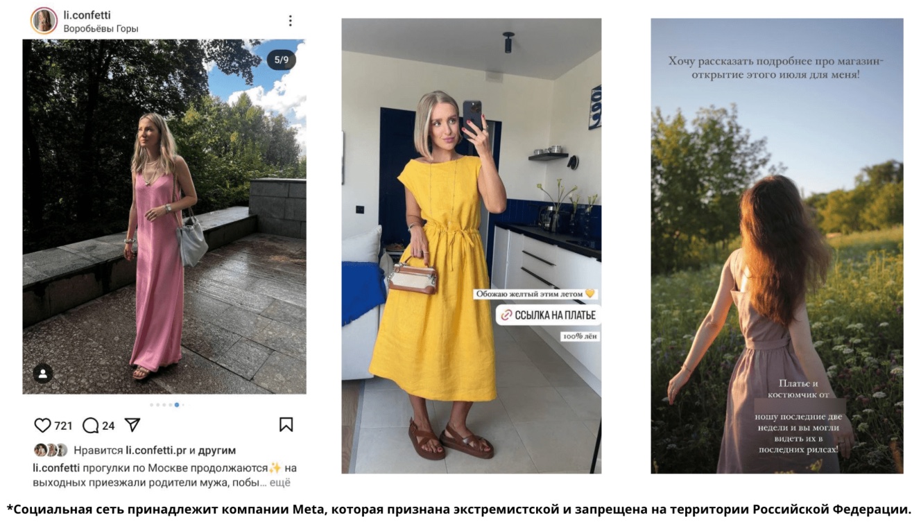 Они публиковали рекламные интеграции в Instagram*, Telegram и YouTube. В видео роликах рассказывали о бренде и его ценностях, проводили примерки нарядов, составляли образы из представленных на сайте изделий. В постах делились фотографиями понравившихся позиций с сайта, давали рекомендации, как сочетать вещи друг с другом.